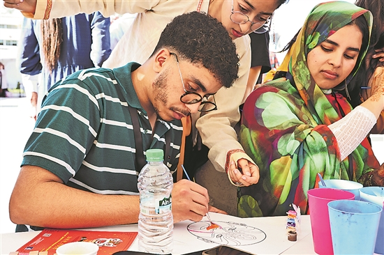 近日,摩洛哥国立拉巴特高等矿业学校举行第20届世界文化节活动,剪窗花、绘脸谱、解鲁班锁等富有中国特色的体验活动让当地青年感受到了中国文化的独特魅力。图为近日,在摩洛哥首都拉巴特,摩洛哥青年学生体验绘脸谱。