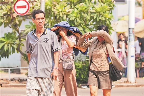 近期,热浪席卷东南亚和南亚大片地区,老挝也遭遇高温酷暑侵袭,最高气温超40摄氏度,给民众正常生产生活带来影响。图为近日,人们走在老挝首都万象街道上时用衣物遮蔽自己。