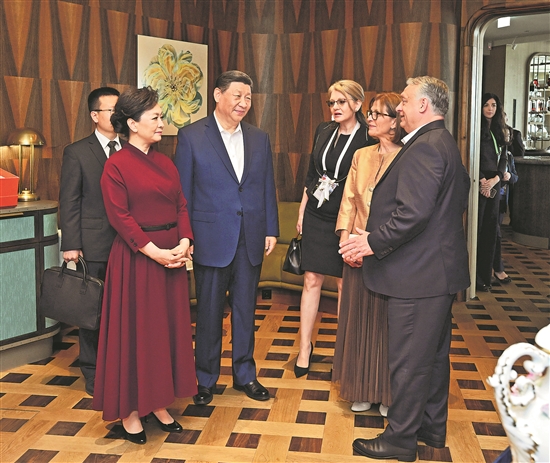 当地时间5月10日中午,国家主席习近平和夫人彭丽媛在布达佩斯应邀出席匈牙利总理欧尔班和夫人举行的饯行活动。 新华社记者 谢环驰 摄