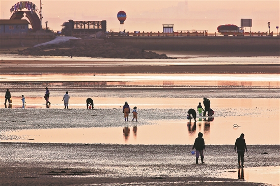 近日,山东省日照市,游客们迎着初升的太阳赶海拾贝的身影,与金色的海面、远处的港口、行驶渔船交相辉映,构成了一幅幅美不胜收的海上生态画卷。郑培波 摄/视觉中国
