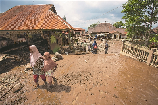 当地时间5月12日,在印度尼西亚西苏门答腊省,人们经过被洪水损毁的房屋。