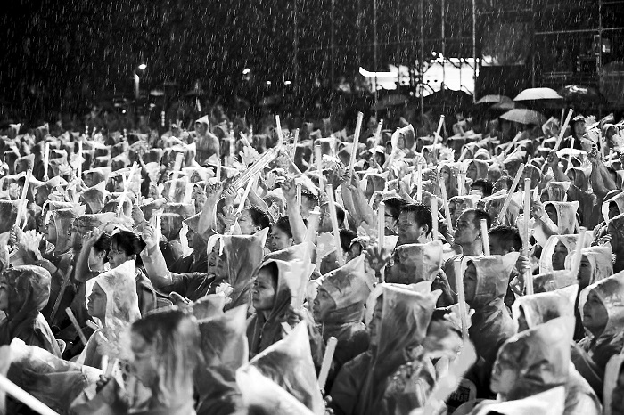 第十一届湖北省黄梅戏艺术节,市民在雨中看戏。程吉杨 摄