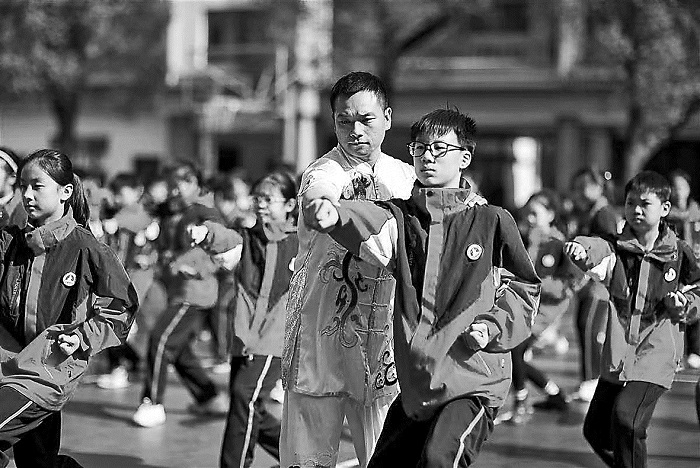 雷超(中)在黄梅县第一小学教授岳家拳。石勋 摄