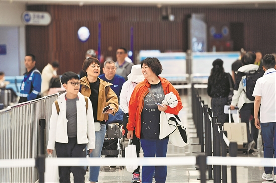 5月15日,旅客在天津国际邮轮母港客运大厅排队等待办理乘船手续。