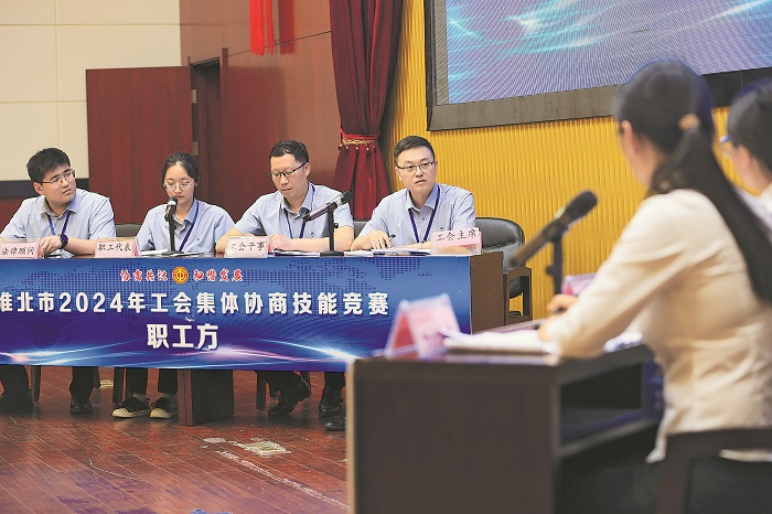 5月15日,安徽省淮北市工会集体协商技能竞赛现场,企业方和职工方在进行模拟协商。