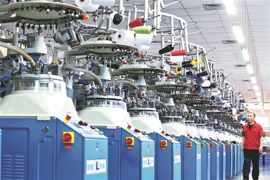 图为山东省青岛市即墨区通济街道一家制袜企业的工人在生产出口的袜子产品。新华社发(梁孝鹏 摄)