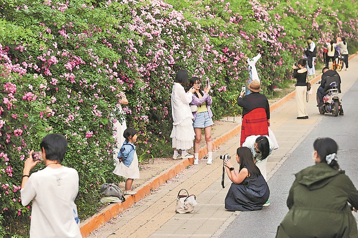 5月14日,在北京奥林匹克森林公园北园东侧安立路旁,游客们三三两两在蔷薇花墙前拍照打卡。5月以来,北京的蔷薇花竞相开放。此处蔷薇花墙绵延千米,如瀑布般垂下,自成一道亮丽的风景线,吸引了众多市民、游客驻足观赏,成为新晋的网红打卡地。