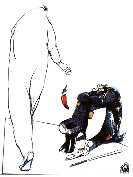 乞丐坐在街角等待人们的施舍,路人见其面前摆着尖顶帽子,立即丢进一个红辣椒,真可谓是“对口”投入,严丝合缝也。