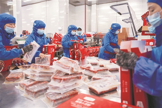 5月19日,南县顺祥食品有限公司工人在车间包装预制好的小龙虾。