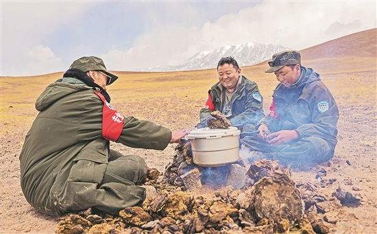 5月10日,野生动物专业管护队员在巡护途中就地取材,用野牦牛粪生火做饭。