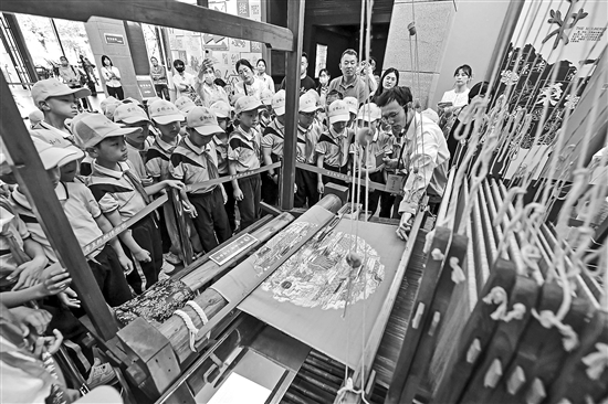 5月16日,安徽省阜阳市苗桥小学学生在安徽京九丝绸股份公司华夏丝绸博物馆参观大花楼织机。当天,苗桥小学组织学生在这里开展以“劳动创造幸福”为主题的实践活动。通过参观生产车间、观看科普视频等,了解养蚕及纺织文化,感受劳动带来的快乐。