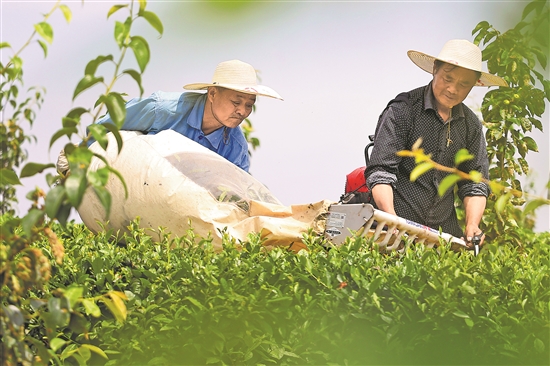 近日,句容市下蜀镇窑业茶场830亩茶园进入夏茶采收期。当地利用采茶机采茶,节约人工成本,提高采收效率,促进茶农增收。新华社发(辛一 摄)