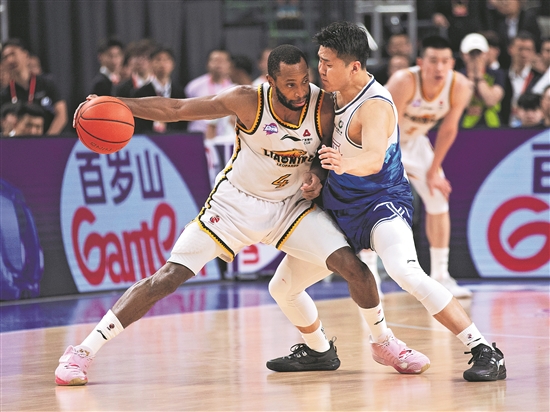 图为辽宁队球员弗格(左)在比赛中面对新疆队黄荣奇的防守。新华社记者 雒圆 摄