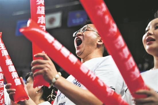 图为新疆队球迷在比赛中为球队加油助威。 新华社记者 王菲 摄