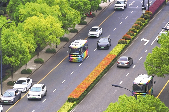 5月22日,自动驾驶接驳示范线巴士行驶在浙江省杭州市余杭区未来科技城的道路上。
