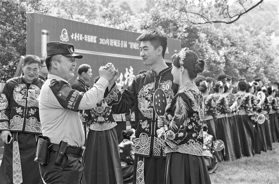 5月20日,安徽省舒城县“舒城红·情定万佛湖”集体婚礼仪式在国家5A级风景区万佛湖举行。舒城县公安局旅游警察大队积极做好交通疏导、治安保障、提供服务等工作,持续营造高质量平安旅游环境。图为执勤辅警向一对新人送祝福。