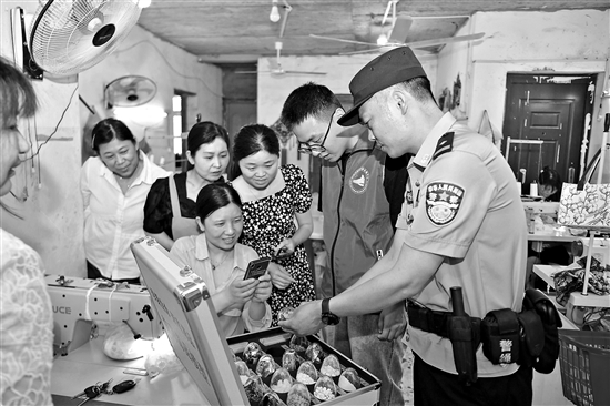 5月20日,在安徽省阜阳市阜南县鹿城镇一微型企业生产车间内,骆寨社区文明实践站工作人员和民警利用仿真毒品模具,向女工们讲解如何辨别毒品。本报通讯员 吕乃明 摄
