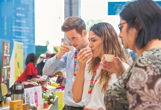 当地时间5月21日,人们在位于意大利罗马的联合国粮农组织总部品尝中国茶。新华社记者 李京 摄