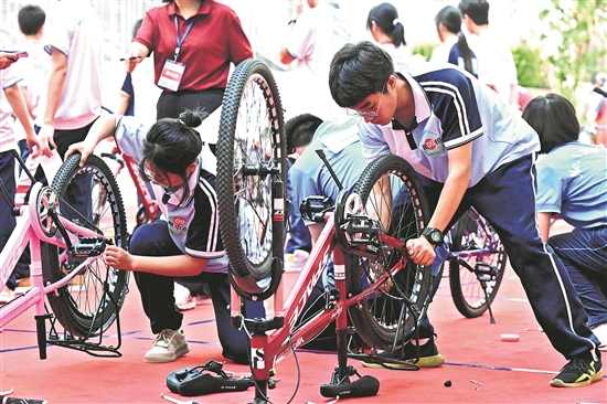 5月23日,学生们参加自行车拆装项目竞赛。5月23日至24日,河北省石家庄市2024年中小学生劳动技能竞赛在石家庄市国源小学举行。本次竞赛设置4个组别,包括技能、烹饪、生活、农耕4大类22个比赛项目,400名选手参赛。 新华社发(陈其保 摄)