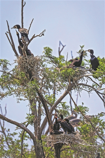 5月20日,在北京密云水库“鸟岛”上,栖息在枝头上的几对鸬鹚幼崽正在等着被投喂。