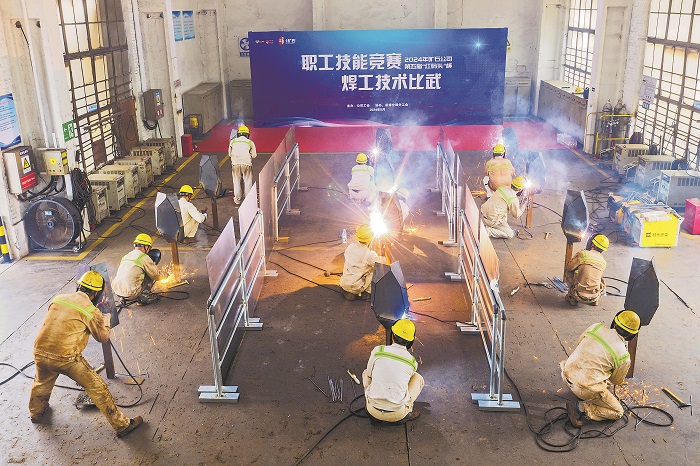 5月24日,浙江宁波舟山港股份有限公司北仑矿石码头分公司举行职工技能大赛焊工技术比武活动,12名焊接能手齐聚一堂,通过平焊、立焊、横焊、仰焊等精湛的手工电弧焊技艺,在规定的时间内焊接出公司工会的品牌LOGO,实现工匠精神与企业文化的双重展示。图为机修分部修理三班的选手们在比拼焊接技艺。蒋晓东 摄
