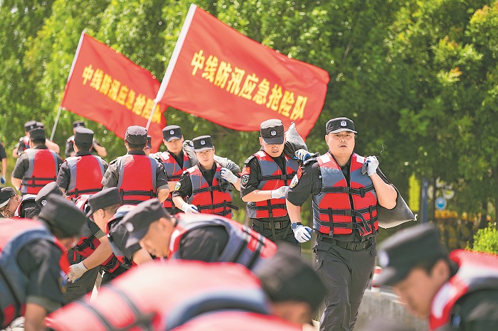 本次演练以“23·7”流域性特大洪水为背景,以南沙河倒虹吸可能发生的险情为场景,按照科目顺序依次开展。现场各支应急抢险队伍及抢险设施设备以实战状态投入演练,实施了铅丝石笼防护、月堤及装配式围井修筑、临水侧子堤抢筑、35kV线缆解除等一系列抢险措施。