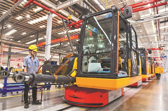 在广西柳州市柳工挖掘机智慧工厂,工作人员操作起重机将液压油缸吊运到挖掘机平台总成(5月10日摄)。