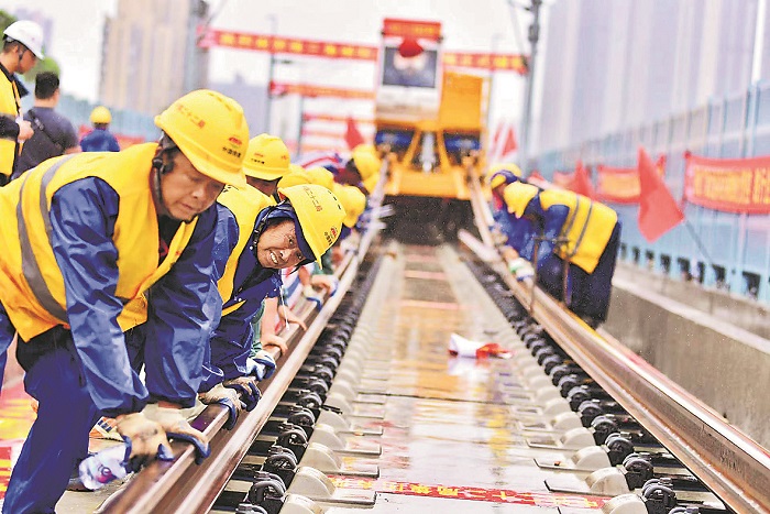 日前,在广州至清远城际铁路北延线建设现场,随着中铁二十二局建设者将首对500米长钢轨平稳铺设在无砟轨道板上,广清城际铁路北延线开始全线铺轨。