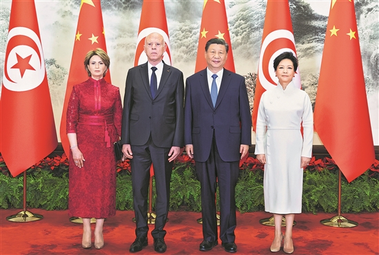 5月31日上午,国家主席习近平在北京人民大会堂同来华国事访问并出席中国-阿拉伯国家合作论坛第十届部长级会议开幕式的突尼斯总统赛义德举行会谈。这是会谈前,习近平和夫人彭丽媛同赛义德和夫人伊什拉芙合影。