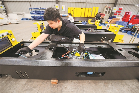 5月31日,在湖南长沙雨花经济开发区的机器人产业集聚区,一家机器人企业的工作人员在查看潜入牵引型机器人线束。
