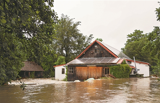 这是当地时间6月2日在德国巴伐利亚州巴本豪森拍摄的被洪水围困的房屋。
