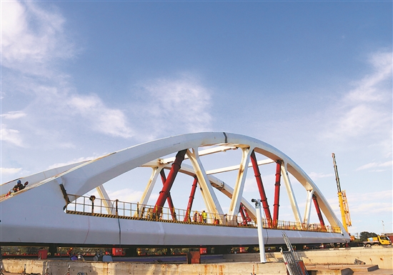 京唐城际铁路跨通济路拱桥顶推完成