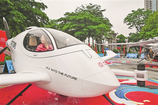 6月3日,观众在广州低空航展上体验无人驾驶载人航空器座舱。