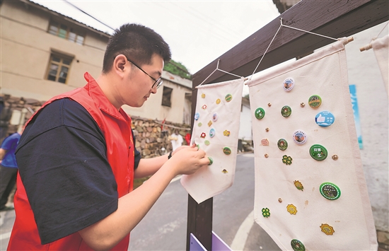 6月4日,在浙江省诸暨市赵家镇走马岗古道徒步入口宣家山村的“走马岗绿色银行”礼品兑换点,志愿者在摆放用于兑换的“环保卫士”徽章。世界环境日到来之际,赵家镇环境保护志愿者在走马岗古道组织开展“保护生态 垃圾换礼”活动,引导更多公众支持、参与生态文明建设和生态环境保护实践。新华社记者 徐昱 摄