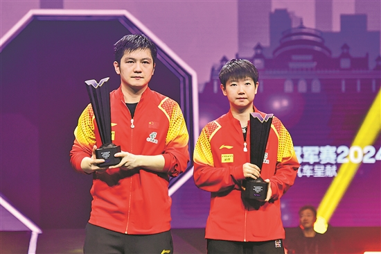 6月3日,国乒选手樊振东、孙颖莎均以大比分4:3战胜队友,分别夺得2024年世界乒乓球职业大联盟(WTT)重庆冠军赛男单和女单冠军。
