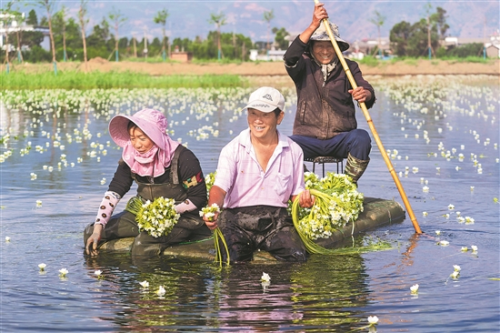 6月5日,在洱源县右所镇永安海菜种植基地,村民在采收海菜花。