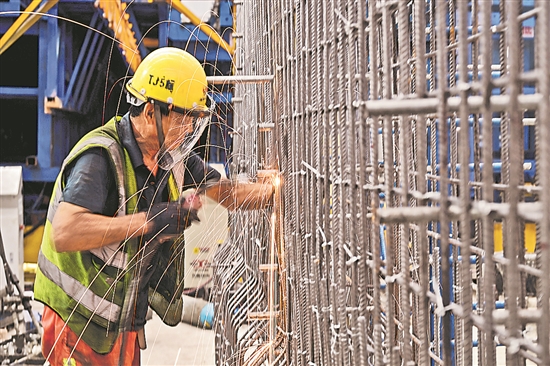 6月5日,施工人员在汕梅高速改扩建项目智慧梁场焊接作业。