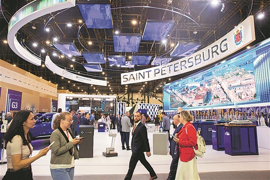当地时间6月5日,人们在俄罗斯圣彼得堡国际经济论坛的展厅内参观。