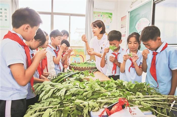 6月5日,在江苏省如皋市东陈镇南凌小学内,中药师带领学生认识艾草,讲解艾草的中药价值。当日,如皋市委网信办联合如皋市中医院,走进南凌小学开展中药香囊迎端午活动。同学们识别艾草、制作中药香囊等,迎接端午佳节。本报通讯员 徐慧 摄