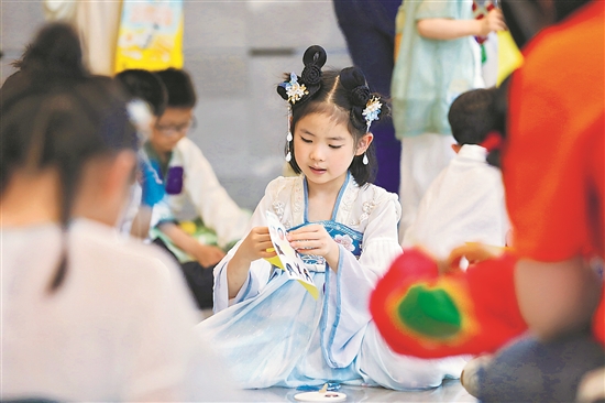 6月8日,在浙江省嘉兴博物馆,小朋友在参加“非遗团扇DIY”活动。
