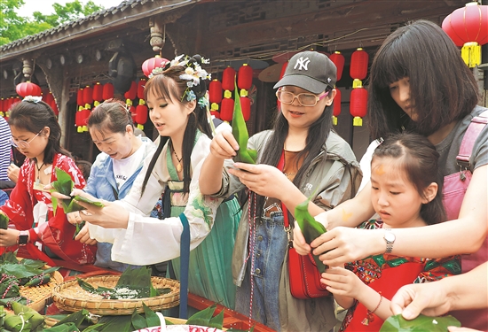 6月8日,游客在四川省成都市彭州市海窝子古镇体验包粽子。