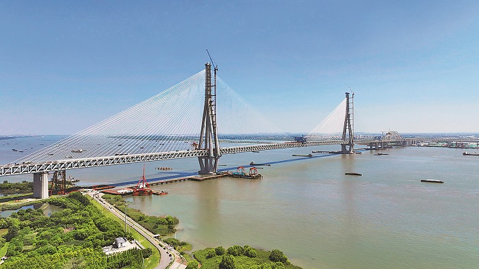 6月9日,随着主航道桥钢桁梁合龙段焊缝焊接完成,常泰长江大桥顺利合龙。历时5年,这座世界最大跨度斜拉桥实现全线贯通。本报通讯员 孙璐 摄