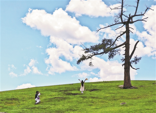 6月4日,新疆阿勒泰地区哈巴河县,游客在“孤独的树”下拍照留影。
