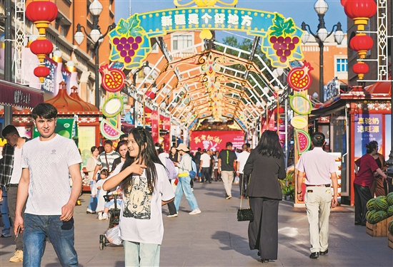 6月7日,游客在乌鲁木齐大巴扎步行街观光。