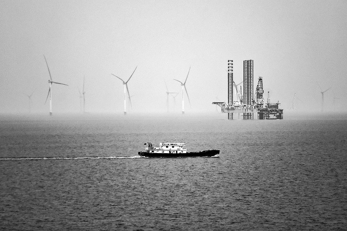 6月4日,一艘巡查船穿梭在胜利油田埕岛中心采油机组间,远处是海上风力发电方阵,不久后,它们将为采油机组提供清洁电能。