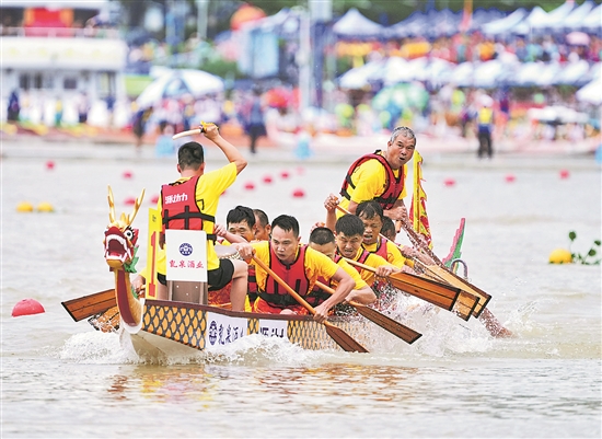 近日,2024年全国龙舟大联动暨南宁龙舟公开赛在南宁邕江大桥畅游阁附近水域举行,吸引广西区内外的50余支队伍、1000多名运动员参赛。图为参赛队伍在比赛中。新华社记者 周华 摄