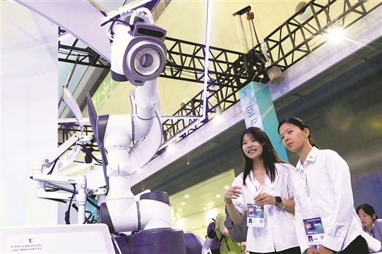 6月12日,观众在交易会上参观超声治疗机器人。