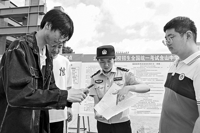 “高考结束后,考生及家长凡收到提前查分之类,需点击链接输入自己的身份信息、银行账户信息的都是诈骗……”6月11日,安徽省马鞍山市含山县公安局组织民警利用学生返校拍毕业照这一契机,开展“高考招生防诈骗”宣传活动。图为民警为考生及家长宣讲如何预防高考后电信网络诈骗。本报通讯员 冯善军 摄