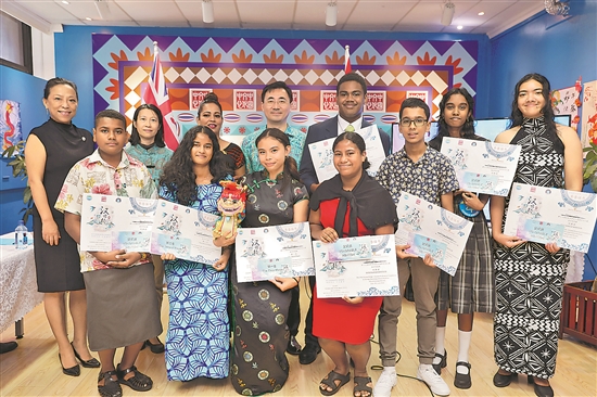 近日,在斐济首都苏瓦,“汉语桥”世界中学生中文比赛斐济赛区参赛选手和嘉宾合影。新华社发(桑钦龙 摄)