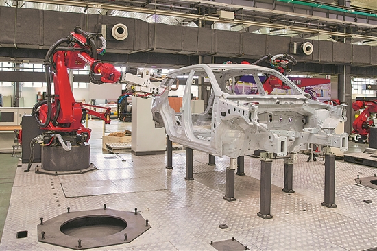 这是6月12日在辽宁省沈阳新松机器人自动化股份有限公司拍摄的白车身点焊机器人。